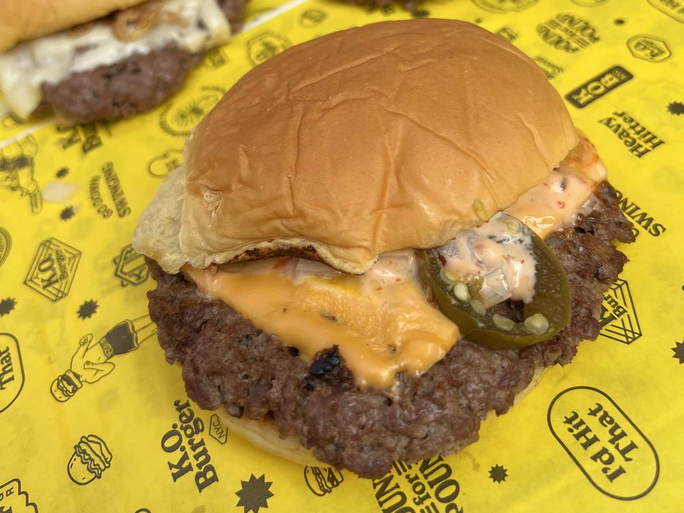 "New York City has yet another new smashburger. Chinatown’s bright red-and-yellow KO Burger is boxing-themed. It burger menu is the “Main Event,” while the Double Jab Chocolate Cookie lives in the “Throw in the Towel” section. We checked out K.O. Burger. Read our first thoughts here." - Will Hartman, Willa Moore