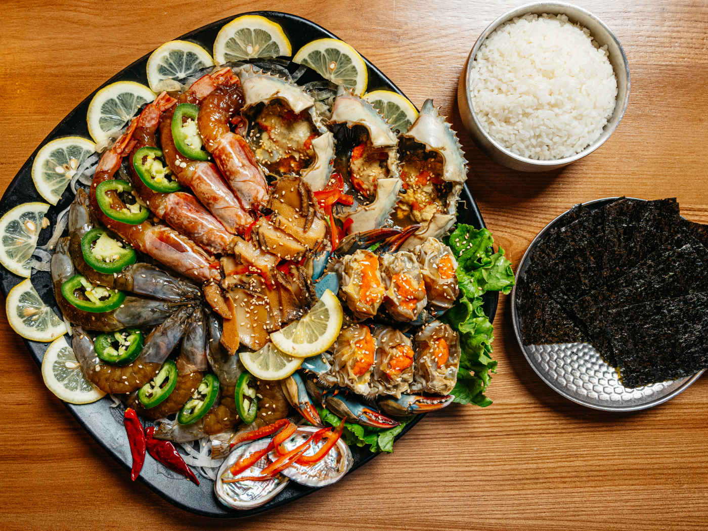 Soy-marinated seafood dishes, including soy-marinated crabs