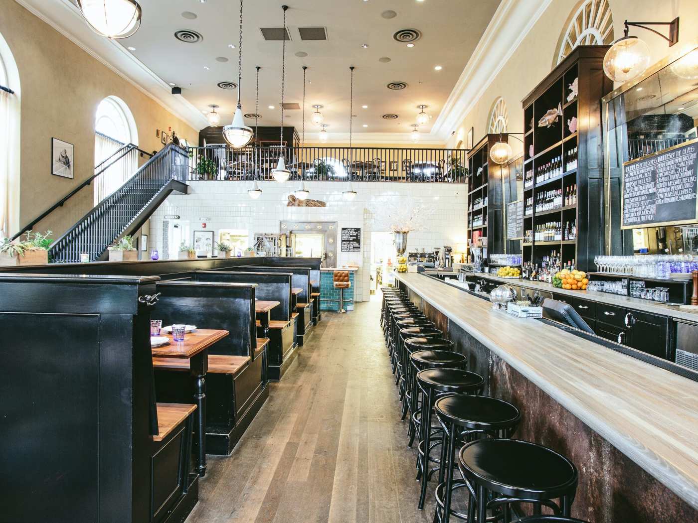 Upscale seafood hall in former bank, raw bar, craft cocktails