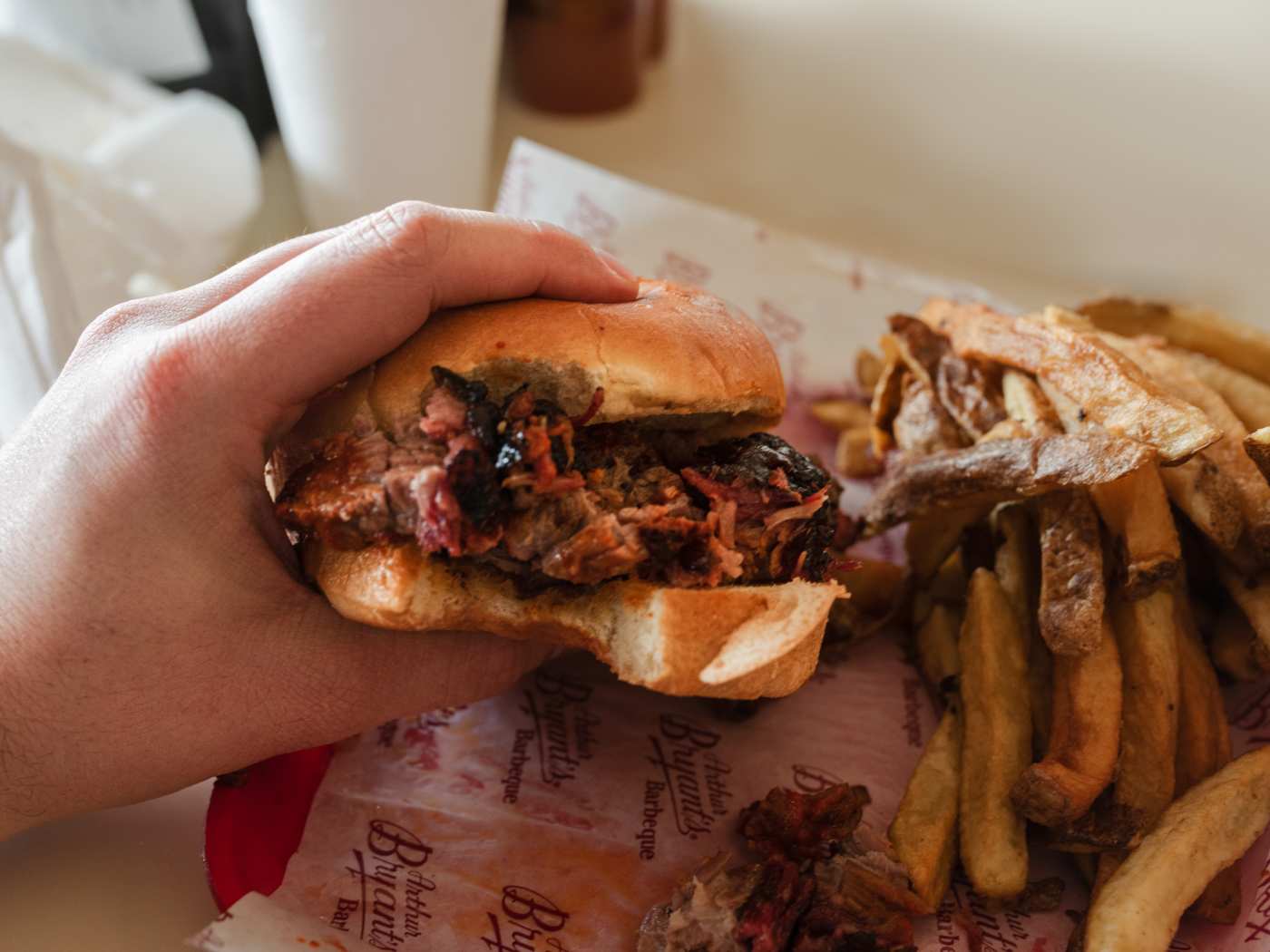 "On the weekends, you’ll find a mix of locals, tourists, and Beltway politicians at this Jazz District restaurant, which writer Calvin Trillin famously decreed “the single best restaurant in the world” in 1972. Bryant’s decor hasn’t changed much since Trillin’s visit: a time capsule of Formica, framed newspaper clippings, and greasy floor tiles. The cooking has changed, though. To meet demand, Bryant’s now cubes whole briskets for most of its burnt ends. (To ensure your ends are cut from the brisket point, go with the 3B sandwich.) No matter what you order, top it with a generous splurt of Bryant’s brick-red, distinctively bitter sauce. No one makes a sauce like Bryant’s — whether that’s good or bad is one of the city’s enduring culinary debates." - Liz Cook