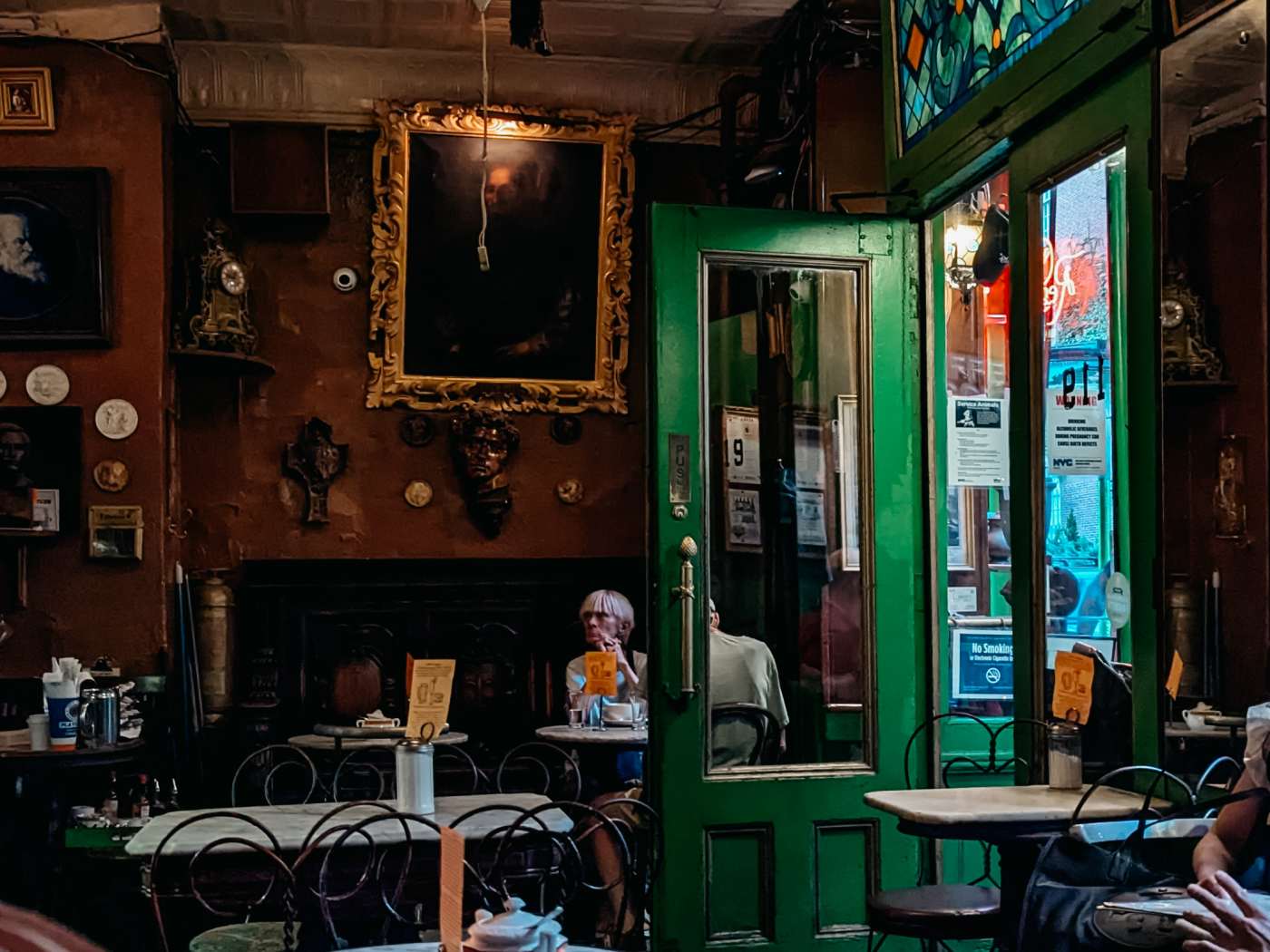 "Sadly, the coffee at Caffe Reggio doesn’t come from the steampunk-looking contraption at the back—said to be the first espresso machine in New York City, brought over from Italy when this spot was established in 1927. But it does come in heavy, custom-made Italian ceramic ware, and it’s available until 3 or 4am most nights. Besides the new coffee machine behind a small counter—and the wifi and mason jars with fresh fruit juices—there aren’t too many concessions to modernity at the Greenwich Village coffee shop. The tin ceiling is crumpled in places, a Renaissance bench is worn to a high polish from all those butts of the past, and heavy oil canvases hang off the walls. The next time you watch "The Godfather Part II" (or "Shaft," or "Serpico") Caffe Reggio should be instantly recognizable. photo credit: Sonal Shah Caffe Reggio does serve food, but we’d use this place mostly for scribbling in a journal while drinking a cappuccino, a pot of tea, or a cheap glass of wine (and maybe spooning up some tiramisu or crunching into a cannoli). The best part is there’s something new to see—or a new conversation to eavesdrop on—every time you look up from your table." - Sonal Shah