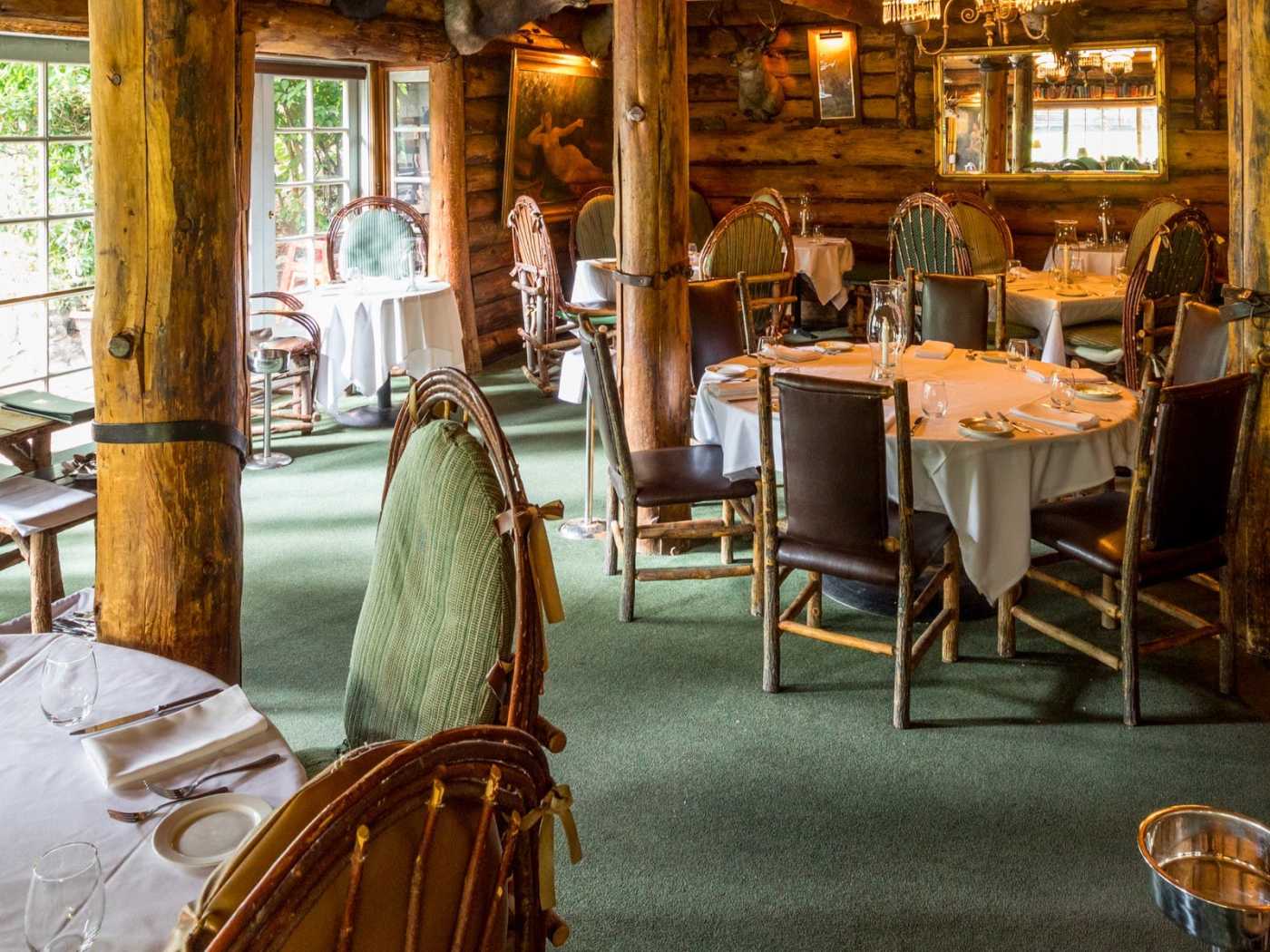Wild game, rustic lodge ambiance, scenic patio dining