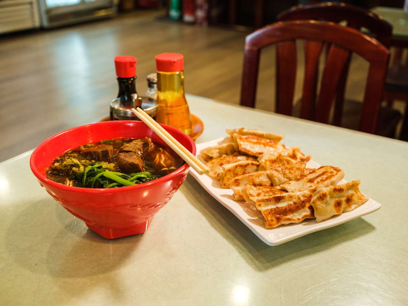 Noodles, dumplings, potstickers, and roast beef noodle soup