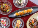 Menu: Roll stuffed with shrimp tempura and avocado, covered with fish of the day flamed in sesame oil, topped with aji amarillo sauce and finely chopped chalaquita
