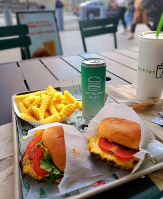 Standard Shake Shack location. Busy, but no line when we stopped in on a Saturday for lunch. My boyfriend ordered and I grabbed a table. We had just had a small lunch, so we shared fries and a salted caramel shake to snack on. The shake was amazing and definitely the best shake shack flavor I've had so far. The fries were hot and fresh. Unfortunately the restaurant is super tiny and hard to maneuver around. Luckily I found a table at the right time, but many people were waiting for our table by the time we were finished. There was a man on a wheelchair that couldn't even get around the tables to the open table in the back.