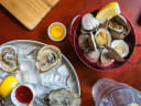 Jumbo lump crab cake sandwich, blackened scallops, side salad, and fried oysters
