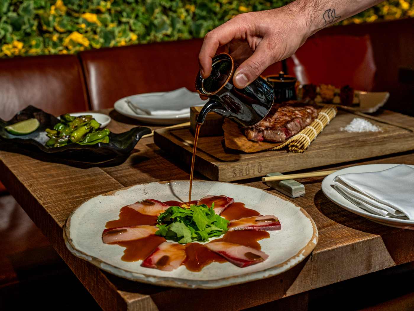 Sushi, robata skewers, Wagyu steak in lavish dining room