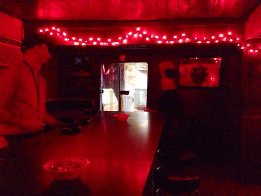 Retro holiday decor, jukebox, late hours, and a shacklike setting