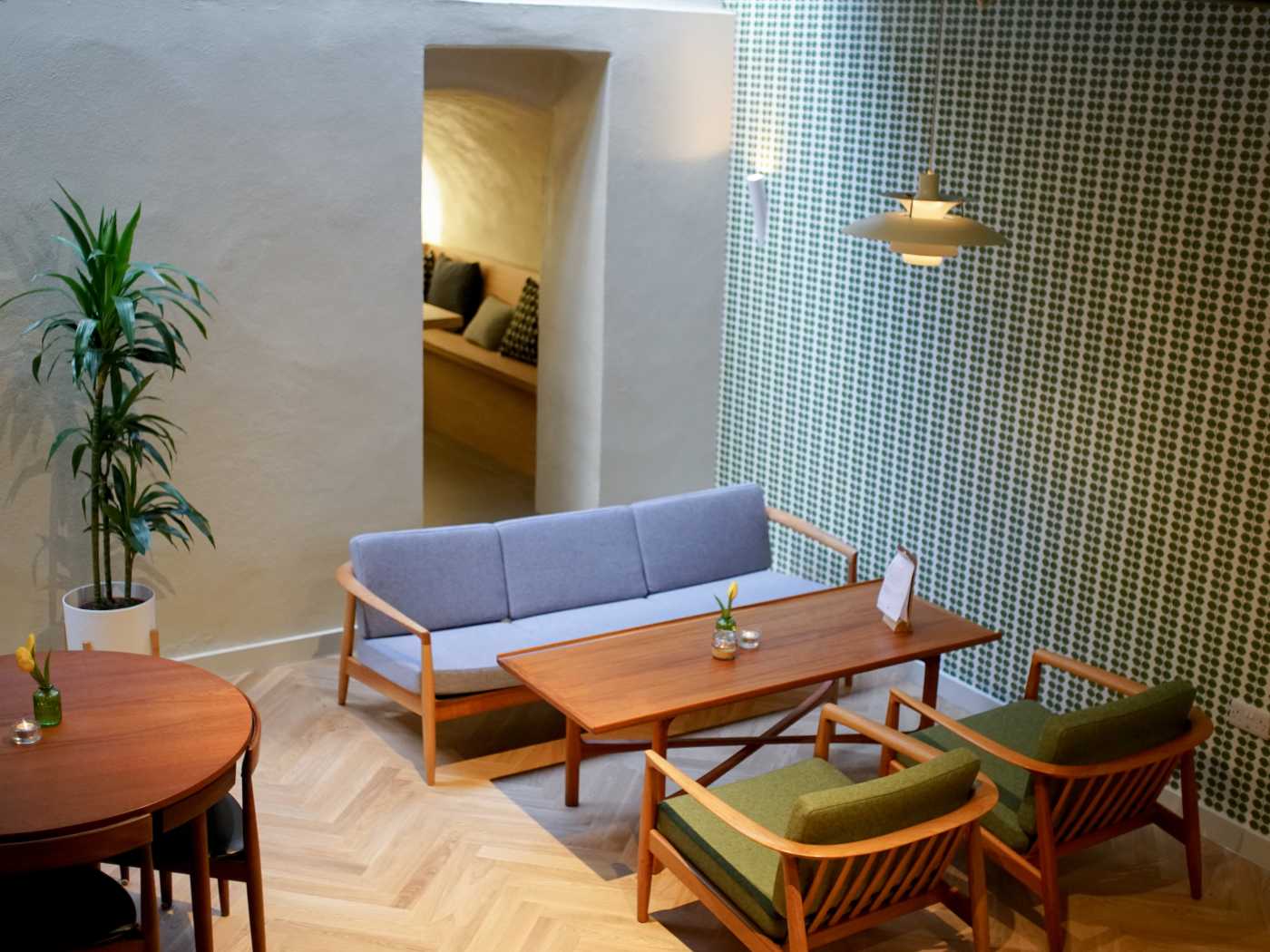 The interiors embrace Nordic minimalism, with a communal table, armchairs around coffee tables, and stools at countertops for those working on laptops. Additional seating downstairs makes it a cosy spot whether you’re dining solo, catching up with a friend, or having a relaxed meeting.