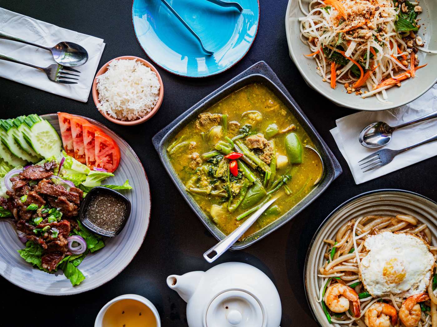Authentic Cambodian dishes like wings, noodle soups, and curries