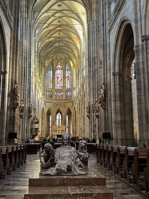 At ground level, the Nave and Chancel contain relatively little of interest, with the notable exception of the ornate silver-gilt baroque tomb of Saint John of Nepomuk, who was martyred by being thrown into the nearby river. The obvious part to head for is the chapel of St Wenceslas, completed in 1345. This includes his tomb, elements of his personal armour and a rather gaudy decorative scheme on the walls consisting of polished panels of semi-precious stones and gilding, all surmounted by wall paintings from the early 16th century.
