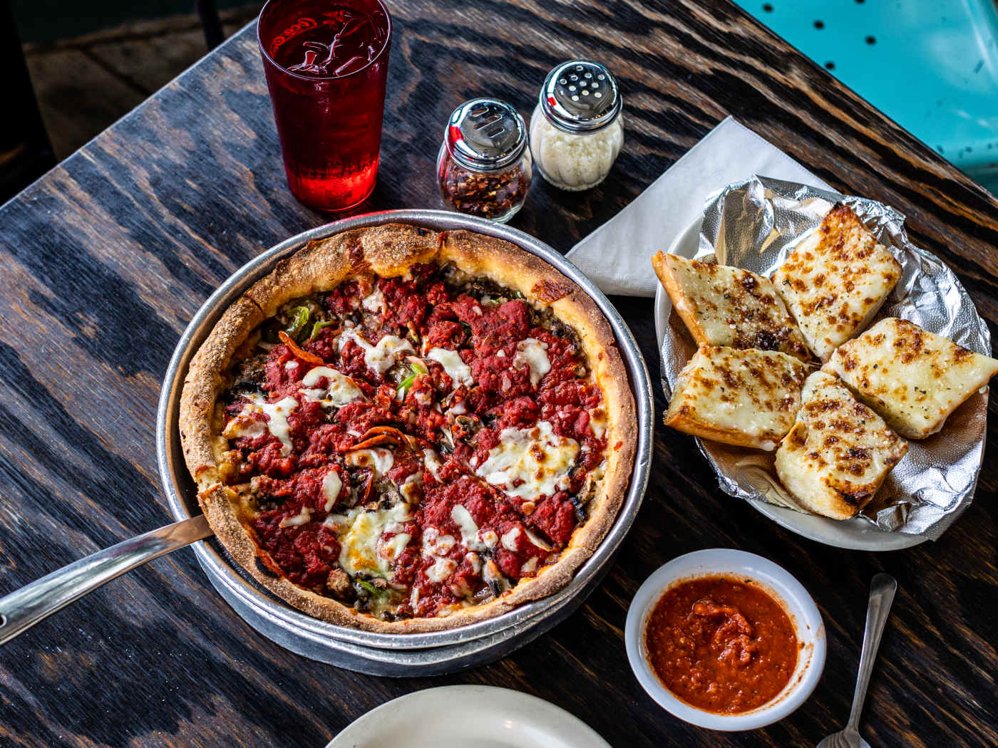 Thick-crust deep dish pizza, house-made ranch, and dessert pies