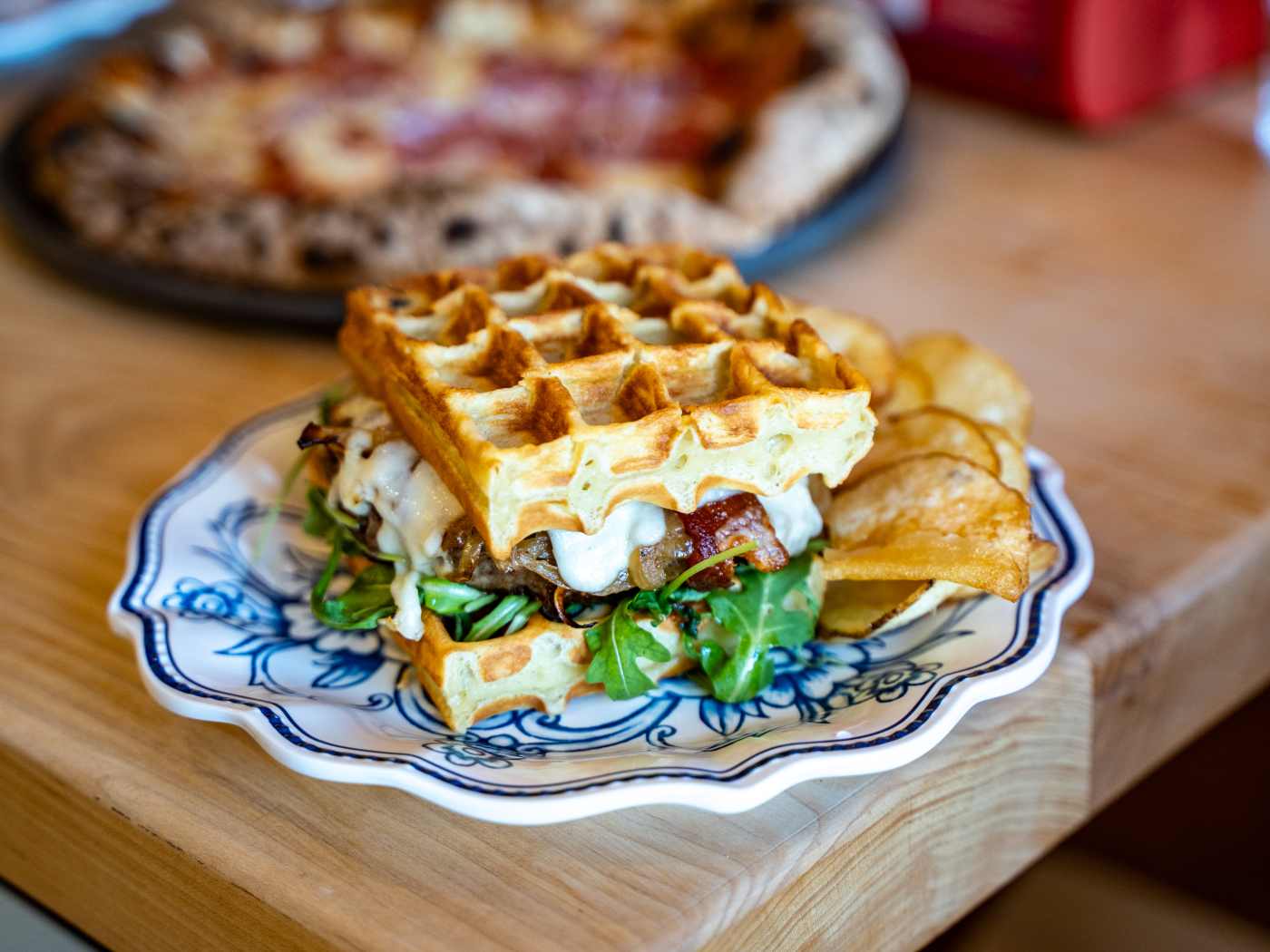 "If you ever judged Luther Vandross for the whole burger-with-donut-buns situation, be prepared to eat crow. While this Mt. Vernon Stellina Pizzereia isn’t pancaking their juicy patty between Krispy Kremes, they do take two square waffles, stack them with arugula, caramelized onions, thick bacon, and gooey mozzarella cheese, and serve you a burger that will have you eating faster than Jughead. Dip the whole thing in the side of bourbon maple syrup for a little extra sweetness, though it’s delicious all on its own." - tristiana hinton, omnia saed