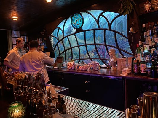 "A playful tropical drinks parlor tucked above a chophouse and designed to evoke a sunken pirate ship, complete with a wooden steering wheel and a mural of submerged treasures; its menu by master mixologist Garret Richard ranges from lighter refreshments like a shiso-garnished daiquiri and a cachaça-and-coconut Batida Dourada to deep, complex offerings in a section called “The Abyss,” including a savory sesame-and-pepper Immortal Martini and a large-format Shattered Skull marrying pomegranate and pineapple with Jamaican and Bajan rums." - Brad Japhe