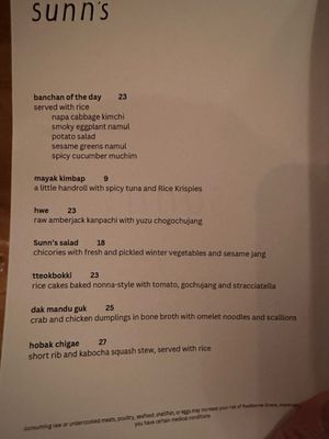 "A tiny Chinatown wine bar where chef Sunny Lee continues her banchan artistry from pop-ups — playing with fermentation, textures, and pickledness — this intimate spot pairs impeccable yet simple food with elegant, restrained dishes, and since opening in late 2024 there are still waits; hands down, it’s one of the most pleasurable dining experiences I’ve had in a while. Start with the banchan (six dishes for $25); on my visit the standouts were creamy, tahini-covered pickled mushrooms and sharp Napa cabbage kimchi. Lee’s produce-packed salad ($22) rotates — a recent plate mixed giardiniera-ed cauliflower, Asian pears, and lotus roots — and the comfy tteokbokki ($26), Sunn’s take on baked ziti, now swaps stracciatella and mozzarella for gouda chunks melted into globs that meld well with the tomato-gochujang sauce. Thanks to Lee’s partnership with Grant Reynold of top NYC wine bar Parcelle, the list is impeccable; explore natural wines like the minerally and unfiltered Riva Arsiglia 2019 white wine by Italian winery Menti, and if you check in with your OpenTable account you’ll get a follow-up email detailing what you drank with links to purchase bottles. Don’t miss the nutty sesame mochi cake ($12) to end the flavor-bomb meal, and insider tip: the space is tiny and tight, so show up 20 minutes before doors open for seats at the bar to watch Lee and the staff prep everything." - Nadia Chaudhury