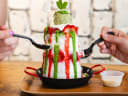 Their strawberry matcha bingsoo is equally delightful, with layers of their perfectly crafted shaved ice studded with pieces of mini mochi, and slightly sweet and tart strawberry puree. The bona fide tour of shaved ice is topped with a huge scoop of matcha ice cream, whipped cream, fresh strawberries, and white chocolate shavings. Then, the entire thing is drizzled with strawberry and matcha syrups, which give the ice lovely stripes of white, red, and green.