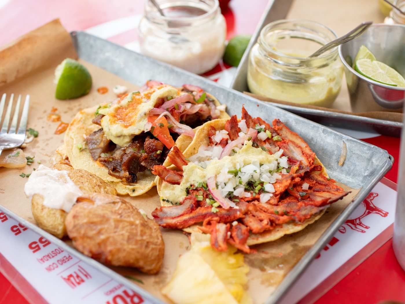 Tacos al pastor, chicharrón, and grilled potatoes