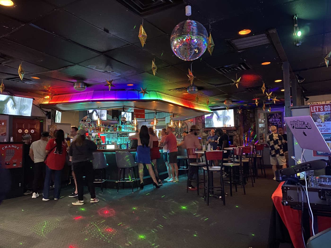 Casual gay bar with pool, darts, karaoke, trivia & theme nights