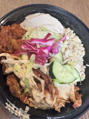 I've been here in the past and remember it being good so went back. This time though, I realized how confusing the menu is. You can order pre designed items or customize it. The whole part of the "fill it up" section is confusing because you only get 1 selection which doesn't sound like "fill it up", why not call it pick 1 vegetable salad? Then when you pick the "toppings", they were kind of bland. It looks pretty and colorful but all underwhelming. The chicken schwarma was bland too. While eating I realized they didn't give us any sauces which might have pulled it together. They should of asked if we wanted any sauce.