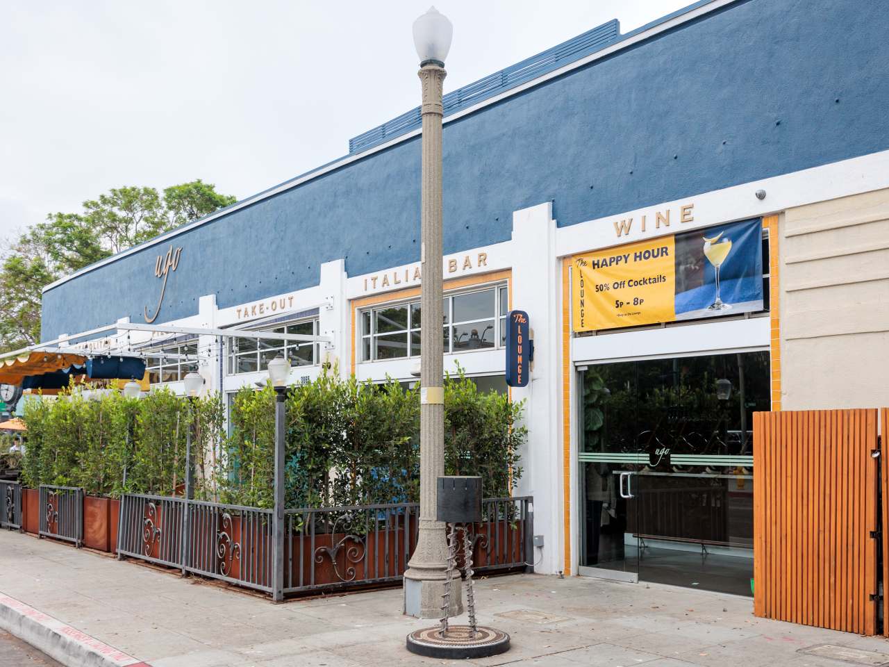 "Located next door to Culver City pasta spot Ugo, the Lounge at Ugo is a candle-lit indoor lounge with a lush, string-lit, tree-lined patio outfitted with fire pits; the menu offers Italian spritzes, signature and classic craft cocktails, small plates like antipasto spiedini, and Neapolitan-style pizzas." - Karen Palmer