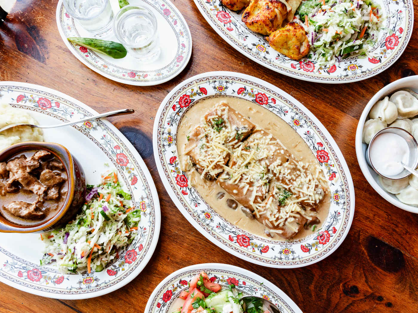 You can absolutely come to Traktir by yourself—we often do on chilly nights when our preferred blanket is a warm bowl of borscht—but if it’s your inaugural visit, bring friends. The portions here are generous and intended to be shared by tables of people who know each other. Most nights extended families crowd into the stained-glass-decorated space and pass giant platters of meat-filled dumplings, stuffed cabbage, and marinated chicken kebabs. A table of eight is considered intimate dining. Smiling waiters arrive with house-infused horseradish vodka shots before they bring out water. There will probably be a light sing-along to a Moldovan music video on one of the TVs. The experience speaks for itself and that’ll get just about anybody through the door. It’s the food, however, that’ll keep them coming back. Well, that and the vodka shots.