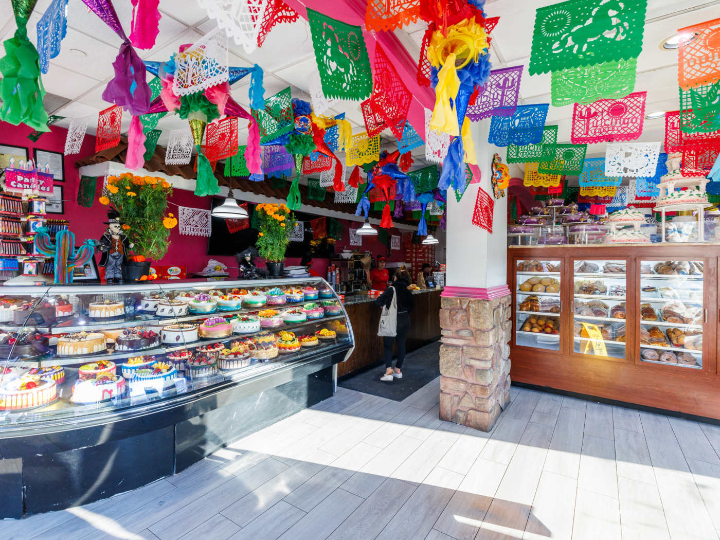 I can't say I'm a fan of Mexican pastries. I find the breads too dry, almost hard and despite the numerous variations in appearance, they mostly taste the same. But if you love this type of bread, make haste to Tulcingo. Cases and cases holding all different assortments of doughnuts, pastries and breads greet you, some filled with guava, some filled with cheese, some just plain and slightly sweet. The assortment is truly astonishing, and frightening for the gluten intolerant. And lest you think the pastries are stale, fret not. On a late Saturday afternoon, the place was hustle and bustle, with customers carrying trays, on the average each sporting 8-12 breads on each tray. I wanted to follow them home to see if all they were feeding hungry alligators with all that bread. The drill is, you take a tray, grab tongs and go for it. These customers were going all out for it. And just in case Tulcingo runs out of bread, which I am sure never happens, there were racks of just baked bread off to the back. And if you wanted fried pork rinds, there was a whole display case devoted just to the stuff, with the handy tongs again. And in case you didn't grab enough carbs, the front of the store has counters filled with whole cakes and tarts. I was almost embarrassed to get only two pieces, the standard guava filled puff pastry and bread. I can't say I would make a special trip to come back for either, but if I were in the nabe, I would stop in just to oogle the varieties.