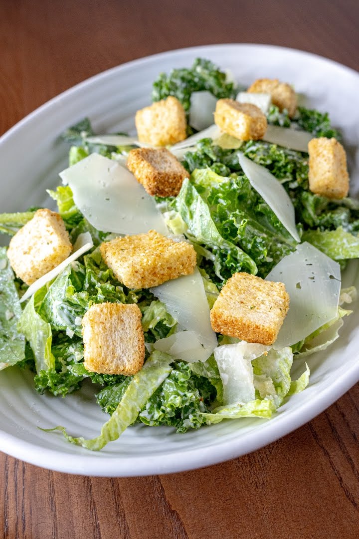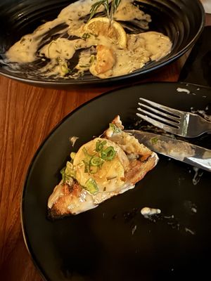 For dinner, we had the salmon with spinach on top of polenta, which had great flavor, a kale Caesar topped with salmon which I ordered specifically at 125° because I hate overcooked salmon and they got it perfect. Also a pasta dish with beef that was so savory and tasty, and finally a perfectly cooked Seabass.