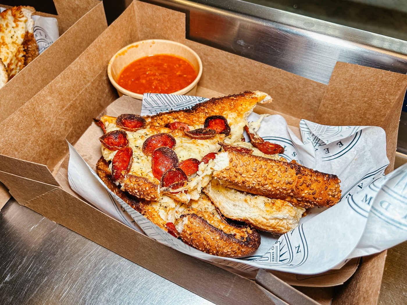 "You can get cheesy garlic bread from Christian Petroni, an Italian-American recipe content creator, made on some actually good semolina bread (a rarity in the stadium) that’s crusty and rich. You can get it topped with meatballs, but they're a bit unwieldy, so you should go with either the plain version, or topped with cupping pepperonis, and a cup of Petroni’s tomato sauce. We haven’t been here yet, but want you to know this spot exists." - Team Infatuation