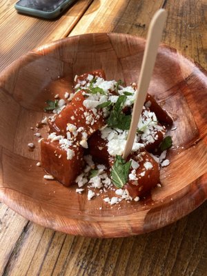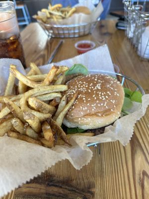 Farm Burger, located in the great VaHi location formerly owned by Yeah! Burger, is a lively but casual spot for burgers, beer and some unexpected surprises. Located on a great, homey corner, I have always considered the patio here to be one of the best in the city for people watching, especially when seated at the bar overlooking the sidewalk on a busy spring or summer evening. This time, we visited on a quiet Friday at noon for lunch. As vegetarians, we are usually not so into burgers, but luckily, Farm Burger has tons of good vegetarian options. She had the farm salad, a refreshing mix of crispy iceberg, nuts, feta and apples. My superfood salad was better, a hearty blend of kale, roasted butternut squash, and crispy chickpeas, dressed in a tangy mustard vinaigrette. I topped mine with a delicious vegan patty, but it honestly didn't need it, given the generous portion of salad. To share, we had an order of crispy fries and bowl of their seasonal special, a summery and refreshing chilled peach gazpacho, which was a surprisingly perfect accompaniment to the meal. For drinks, we sampled their frozen cocktail options. She had the frozen mai-tai, whereas I went with the VaHi sling. Both were delicious, and we can't wait to go back to have again. Farm Burger is a great addition to the neighborhood, and a great place to while away a warm afternoon with great food and drinks.