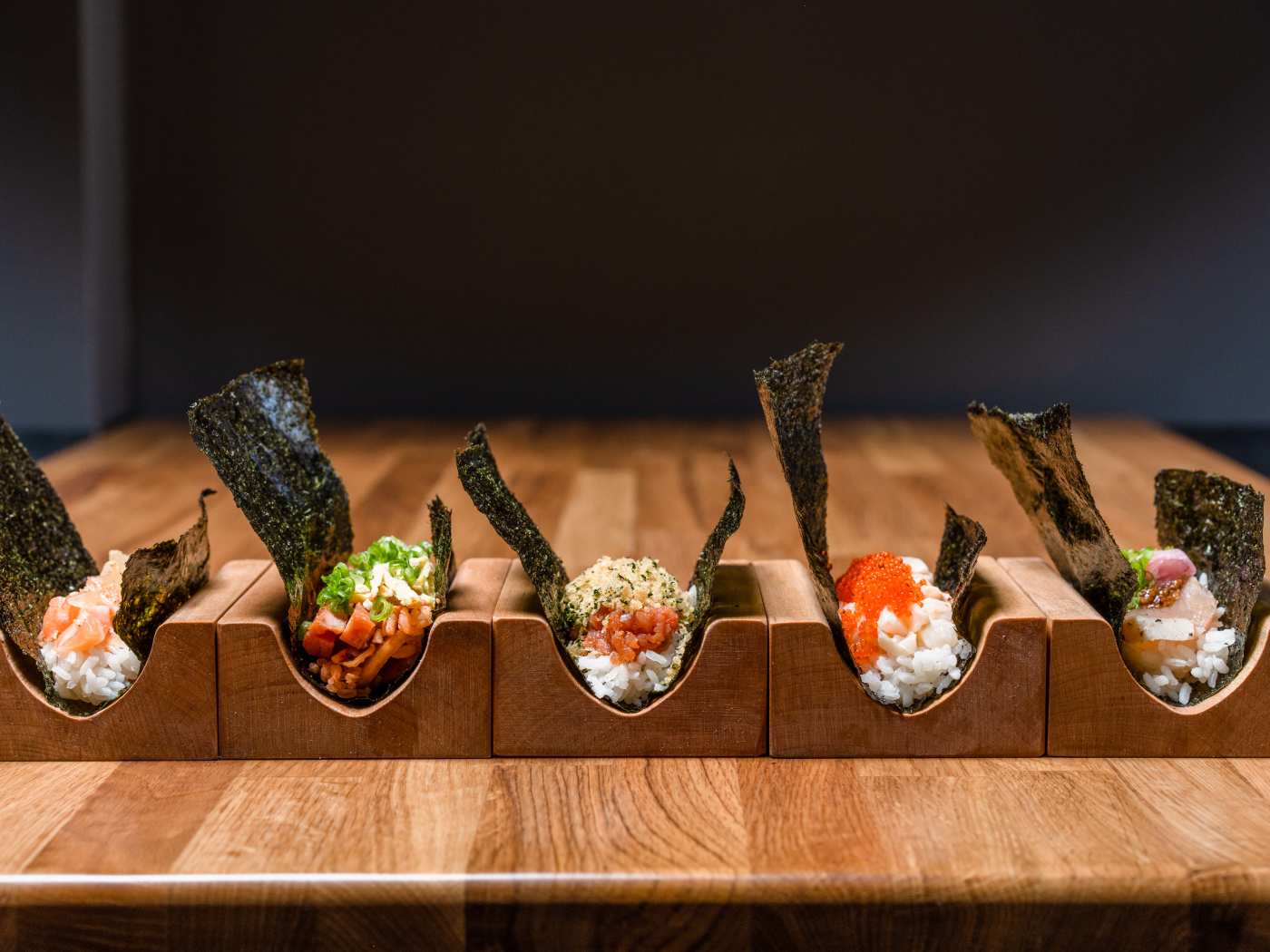 "The Uptown spot feels like a relaxed bistro with high-top seating and neon lights. It’s an ideal setting to appreciate soy-cured ahi tuna, spicy scallops, king crab, and other sushi fish stuffed inside seaweed. Their versions are pretty straightforward (there isn’t any gold foil or speck of caviar in sight) but also playful, so you'll see one with kimchi fried rice and spam. The casualness here is part of its appeal, and why this place is well-suited for intimate yet lively group dinners. One option is to order handrolls a la carte, but we prefer making life easy and going with one of the three sets (five handrolls, $29-$52)." - julia chen 1, lani conway