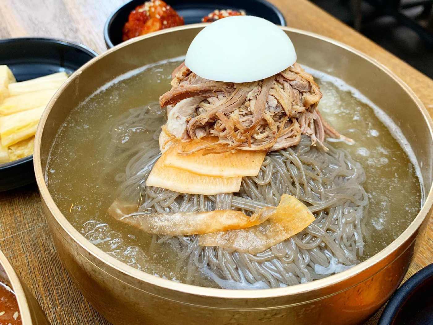 "I turn to this San Gabriel spot for icy, tangy naengmyeon when it’s hot—the broth cools you from the inside and the thin chewy buckwheat noodles are light yet unexpectedly filling; hot mustard and vinegar come on the side but I find the soup pitch-perfect as served. On another visit the restaurant’s signature yuk gae jang impressed me most with chile-spiked ox bone broth, plentiful Angus brisket, and silky handmade noodles—the portions are large enough to share." - Eater Staff