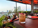 The waitstaff promptly seated us on a low based wicker couch with cushions in front of our own bamboo coffee table adorned with modern stylized tiki torches. The skyline view from my perch was astonishing at 10pm on a cool March evening. You can see the other buildings with all their lights glistening yet letting the eyes wonder down to ground level the ants have no idea they're being watched from above. Zanzibar's menu is limited but the bounty from the big game hunt is astonishing and I highly encourage indulging in their offerings. First up the tropical cocktails are phenomenal. We had several drinks and they all had a flair to them; flowers kiss the rim, fire burns on top and in the center, herbs swim liberally, fruits float on top of these expertly crafted and whimsical cocktails while some are served in playfully made canteens and glasses. I can't recommend one as I have a character limit on this review but I don't think there's a bad choice.
