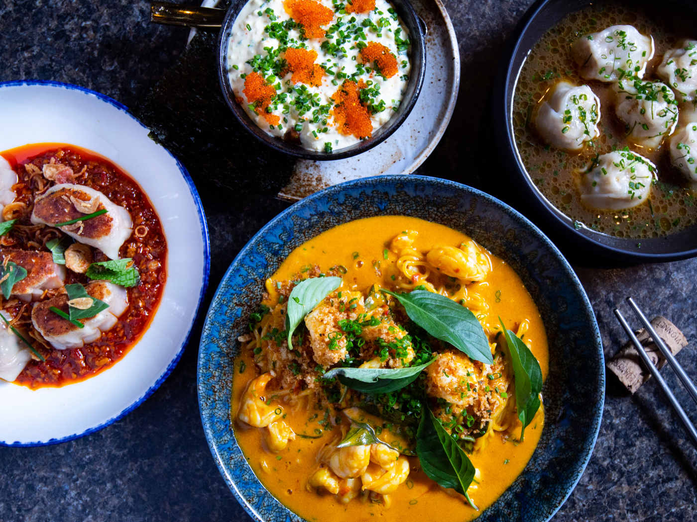 Asian-inspired diner with creative fusion dishes, dumplings, and natural wines